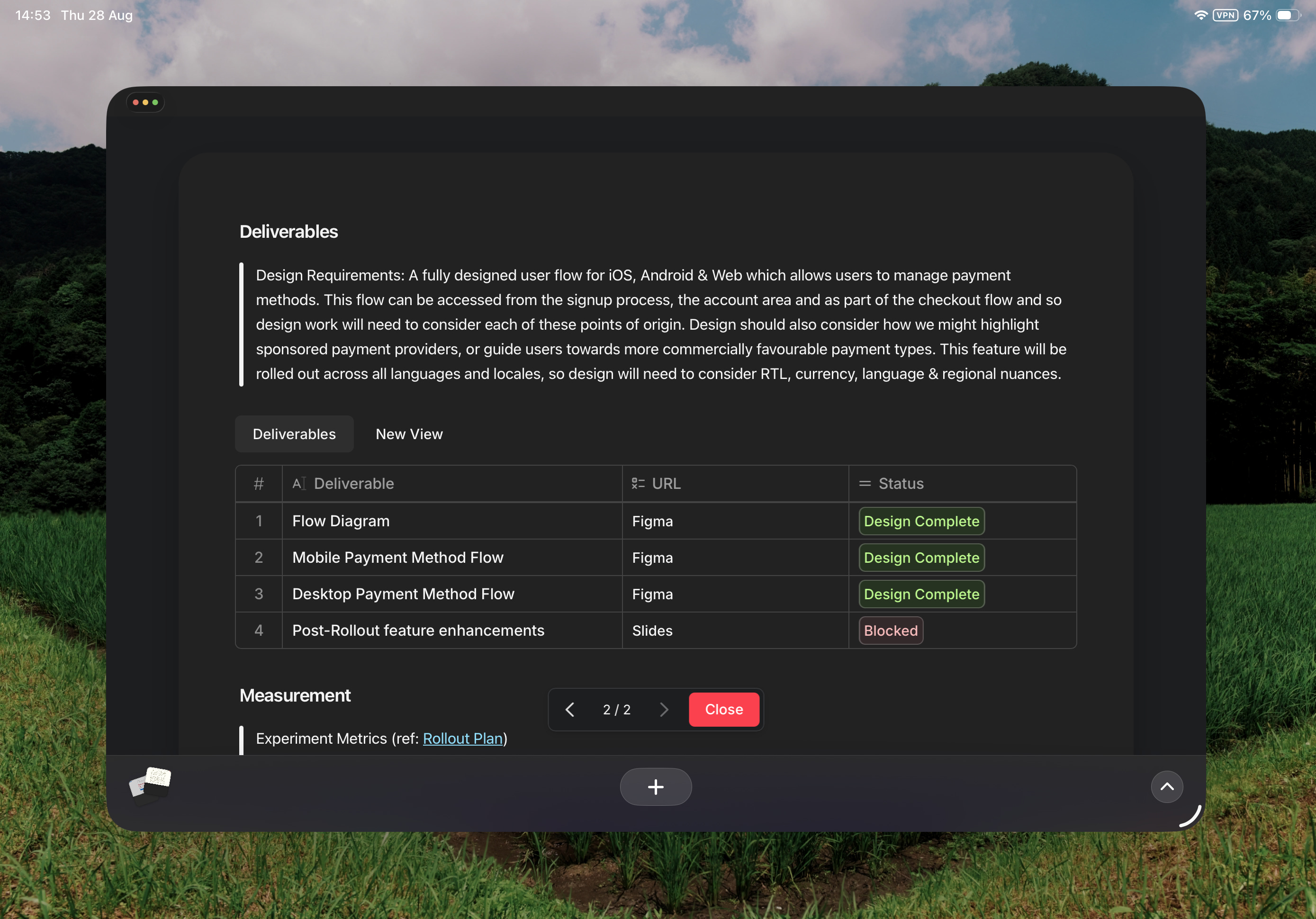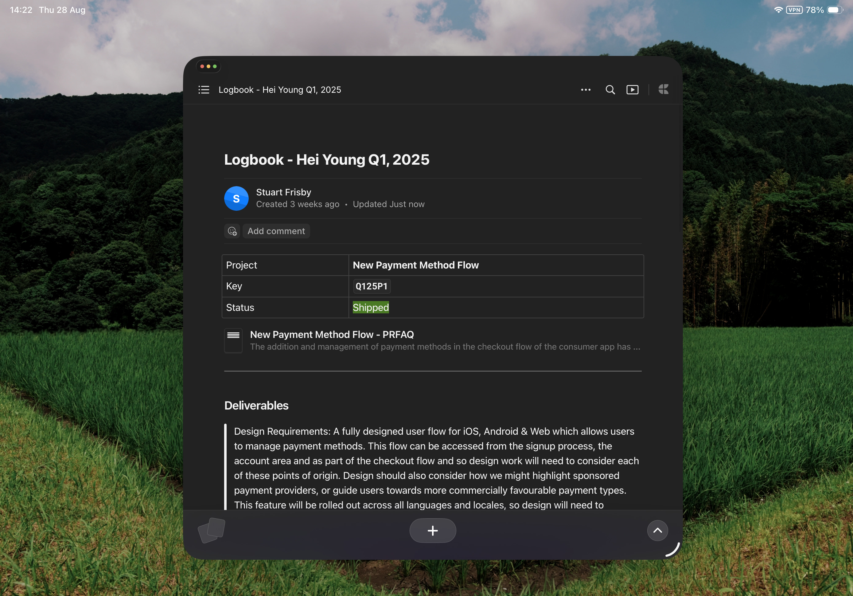 The logbook also includes a list of deliverables which the designer created, not just the end-state of the work which may or may not have gone live, but the thinking, the synthesis, the exploration, the version the designer considered the MVP, the version which was subsequently shipped as the MVP, the fast-follow, the long-term vision, etc, etc. This shows the work, not just the tip of the iceberg which we are typically showing peers through other processes.